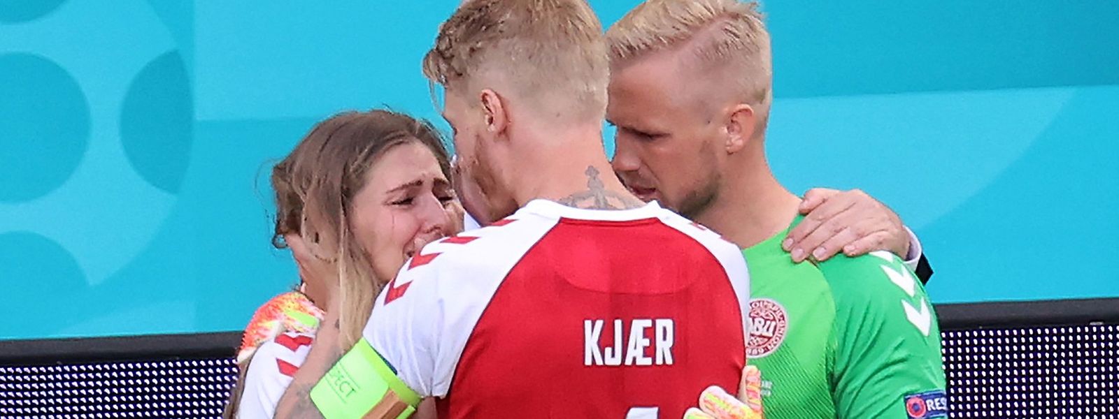Kapten timnas denmark, simon kjaer berusaha menenangkan kekasih christian eriksen, sabrina kvist jensen di tengah laga penyisihan grup b piala eropa antara denmark melawan finlandia di kopenhagen, denmark, 12 juni 2021.